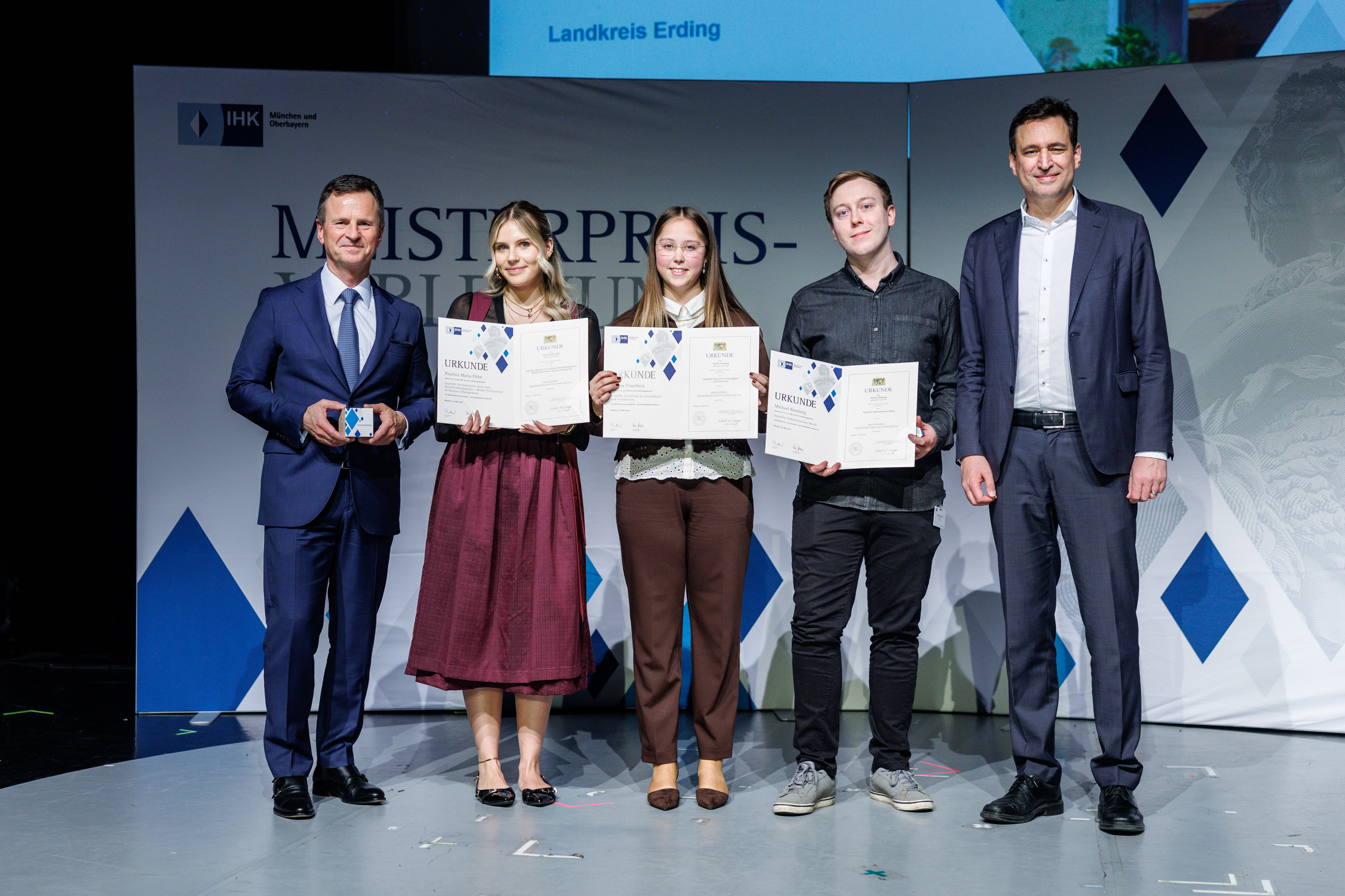 Der Bayerische Staatsminister für Justiz Georg Eisenreich (CSU), und Manfred Gößl, Hauptgeschäftsführer der IHK für München und Oberbayern, gratulierten herzlich. Gößl betonte: „Sie haben mit Ihren Leistungen eindrucksvoll gezeigt, wie erfolgreich berufliche Karrierewege sein können. Ihr Wissen und Können sind gefragter denn je. Als hochqualifizierte Fach- und Führungskräfte sichern Sie die Zukunftsfähigkeit der bayerischen Wirtschaft.“