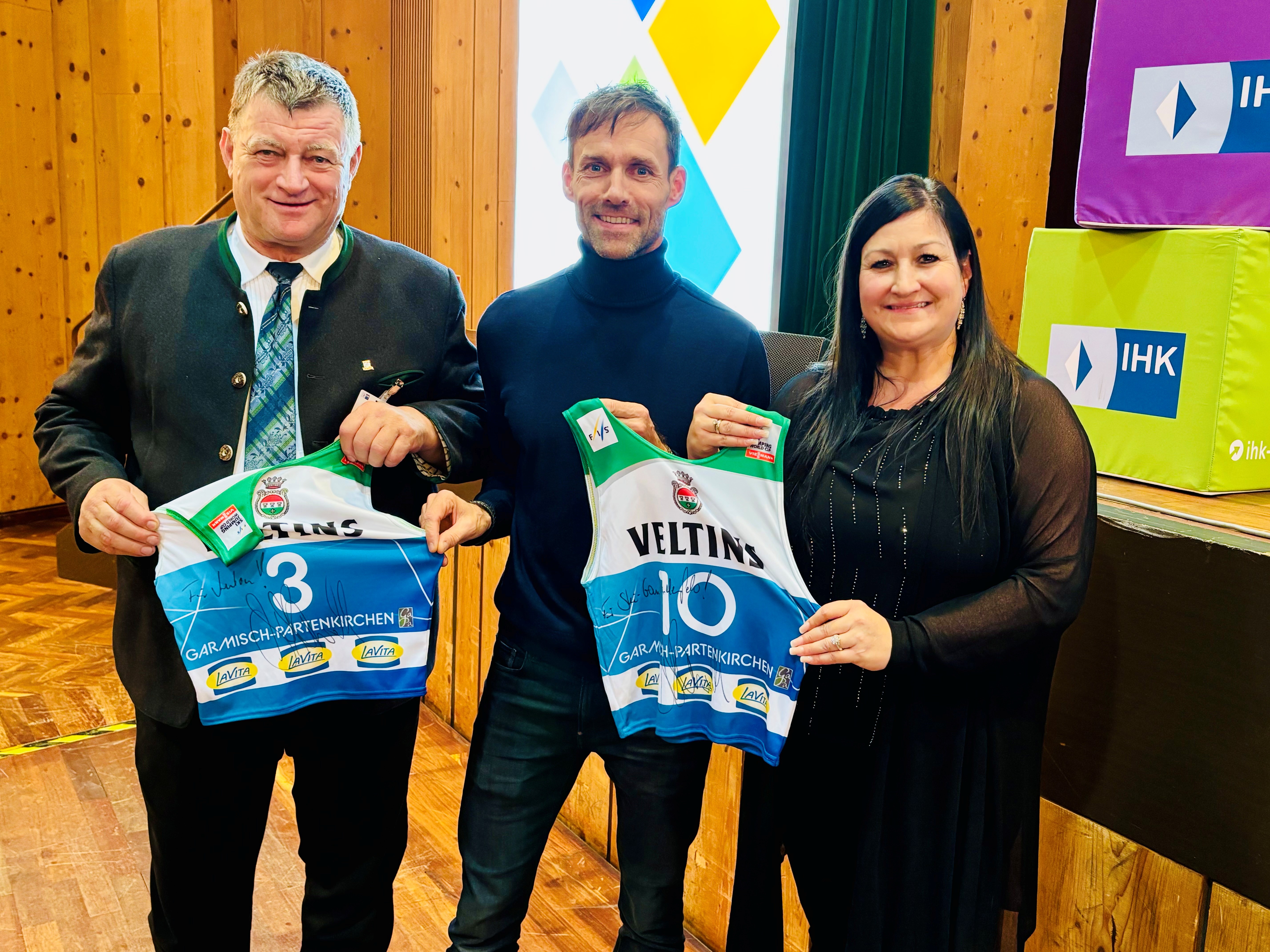 Bildunterschrift: (v.l.n.r.) Landrat Anton Speer (Freie Wähler), Ehrengast Sven Hannawald und Katrin Eißler, Vorsitzende des IHK-Regionalausschusses Garmisch-Partenkirchen am 17.11.2025 im Kongresshaus Garmisch-Partenkirchen. (Bildcredit: IHK für München und Oberbayern)