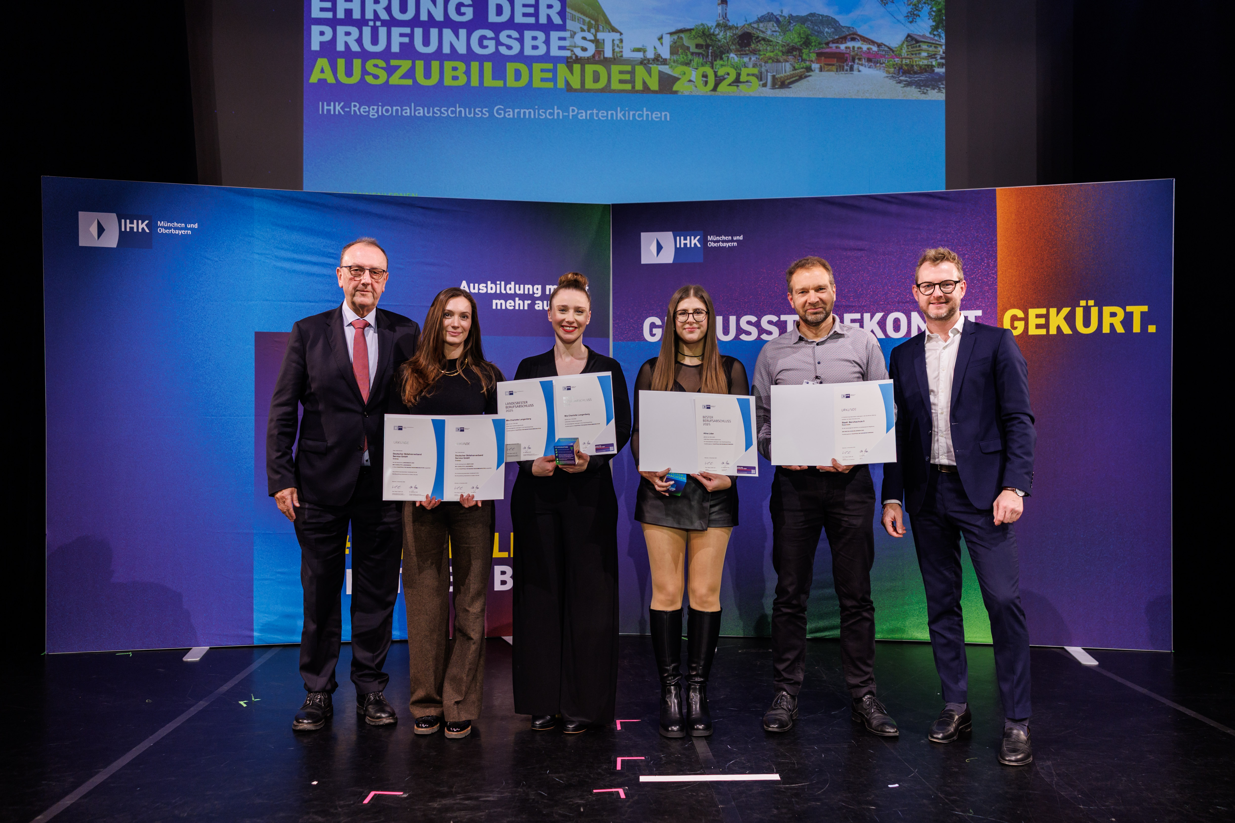 Bildunterschrift.: Reinhard Häckl (li.), Vorsitzender des IHK-Regionalausschusses Landsberg, und Jens Wucherpfennig (re.) von der IHK für München und Oberbayern gratulieren den Spitzen-Absolventinnen Mia Langenberg (3.v.l.) und Alina Lider (3.v.r.) aus dem Landkreis Garmisch-Partenkirchen sowie ihren Ausbildern und Lehrkräften am 19.11.2025 im Münchner GOP Varieté Theater. © Matthias Balk / IHK München und Oberbayern.
