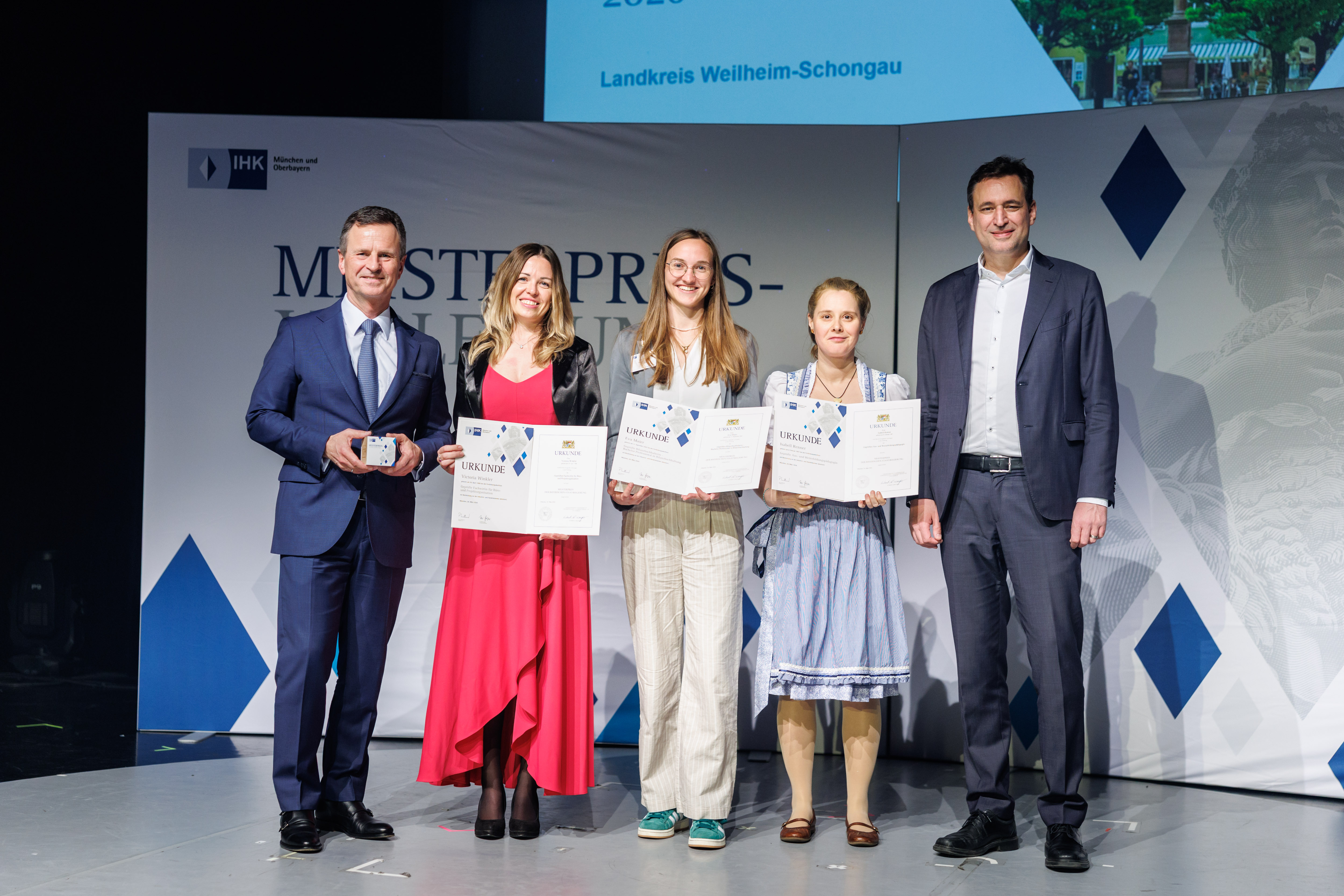 Der Bayerische Staatsminister für Justiz Georg Eisenreich (CSU), und Manfred Gößl, Hauptgeschäftsführer der IHK für München und Oberbayern, gratulierten herzlich. Gößl betonte: „Sie haben mit Ihren Leistungen eindrucksvoll gezeigt, wie erfolgreich berufliche Karrierewege sein können. Ihr Wissen und Können sind gefragter denn je. Als hochqualifizierte Fach- und Führungskräfte sichern Sie die Zukunftsfähigkeit der bayerischen Wirtschaft.“